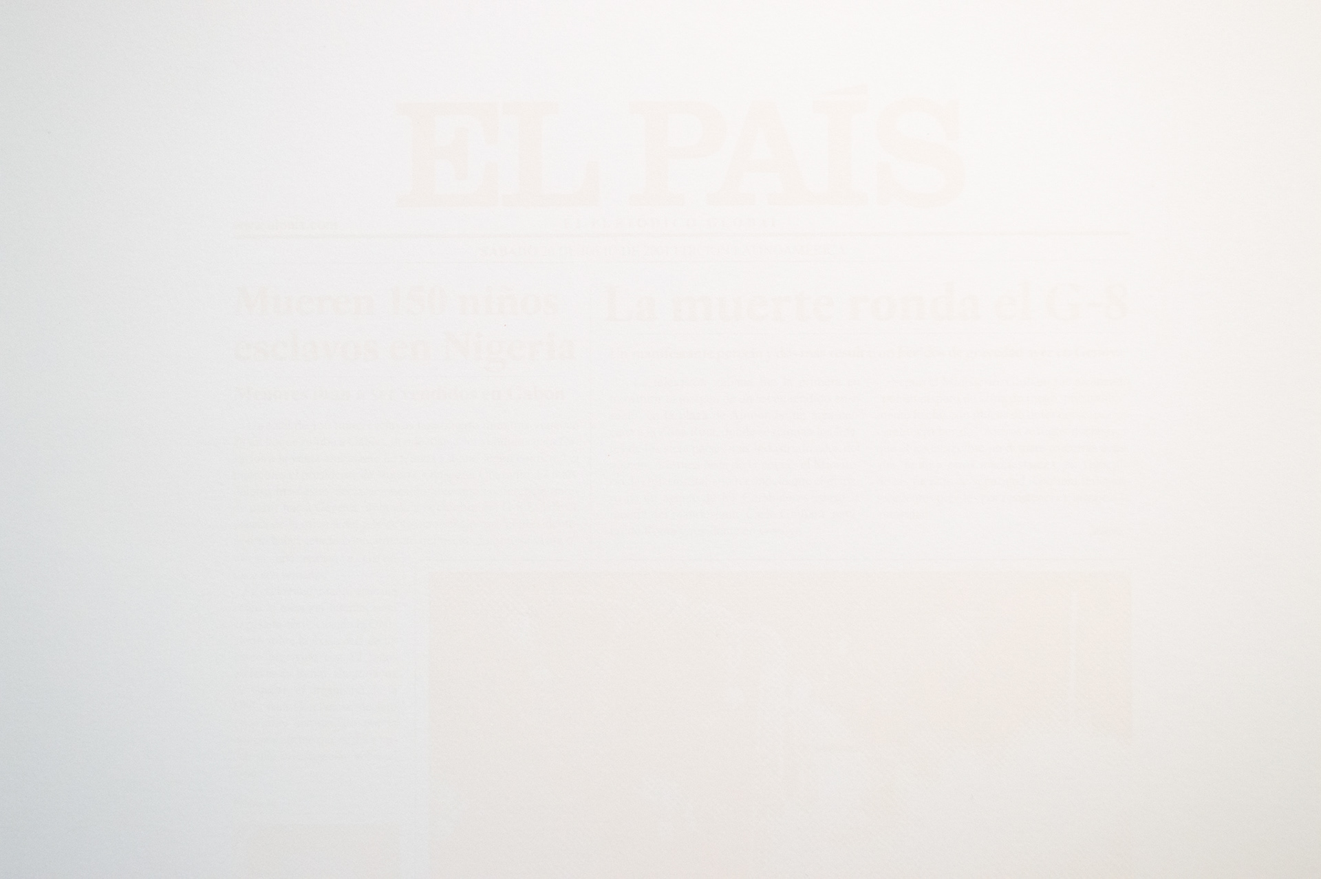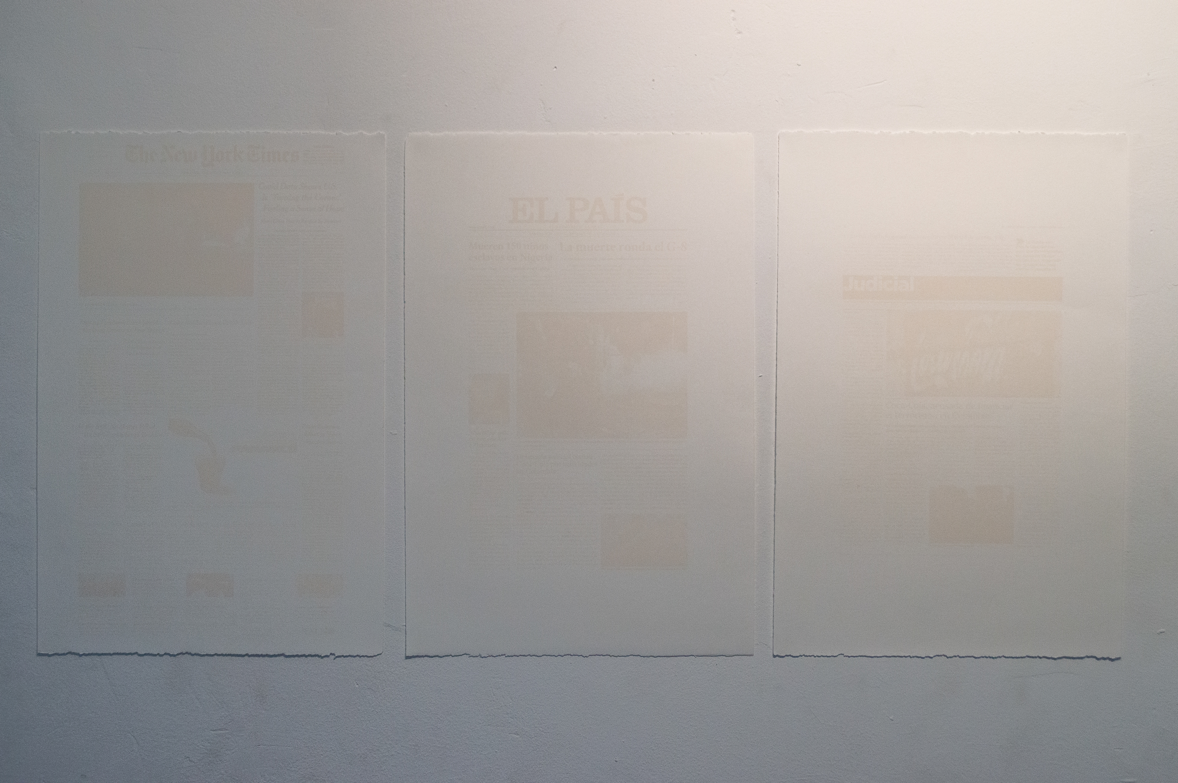 "Barely perceptible" impressions of newspaper pages with inserted news about alleged links of the Colombian Coca-Cola bottlers with paramilitary groups.