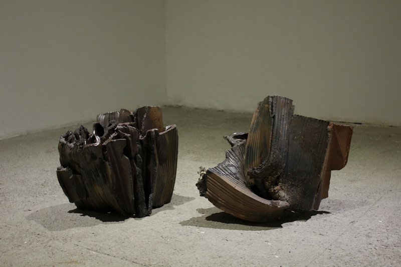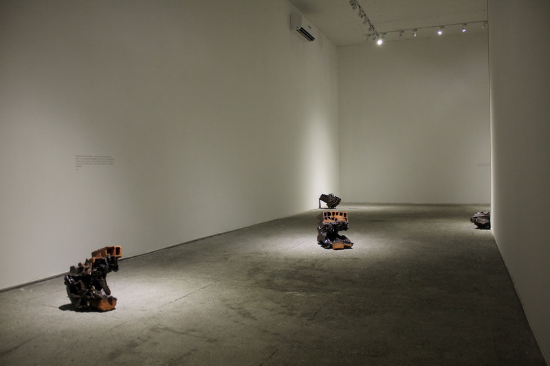 La primera vez que se mostró este proyecto, en la sala de exhibición de Bellas Artes de Cali, dispuse estos objetos de dos maneras: en un primer espacio ubiqué los de menor tamaño, repartidos en pequeños grupos y en ocasiones tirados espontáneamente, como una forma de crear un diálogo con el espacio que remitiera a la disposición de estos objetos en su ambiente originario, conser- vando la idea de la fábrica y la dinámica cotidiana del trabajador. En un segundo espacio dispuse objetos de mayor volumen direc- tamente sobre el piso, más para ser leídos como esculturas, como figuras que sugieren edificaciones, algunas recostadas directa- mente sobre los muros. Una luz muy puntual generó un ambiente oscuro con la intención de realzar los objetos y dramatizar sus formas. Finalmente, después de observar los objetos distribuidos en la sala, logré ver que comenzaban a entrar en un diálogo con la arquitectura que los contenía, con el espacio, y ahí recordé a las esculturas de Matta-Clark: segmentos de arquitectura, extracciones, cortes traídos a colación. Esto me hizo pensar un poco más acerca de cómo estas formas que surgen de un edificio arquetípico (el horno), estaban hablando al mismo tiempo de la arquitectura misma y de su manifestación en el entorno, también cómo estos fragmentos de arquitectura se asemejan a cuerpos deformes, erróneos pero al mismo tiempo muy reales. Entonces decidí citar a Matta-Clark e instalar frases sobre anarquitectura alrededor de toda la exposición.