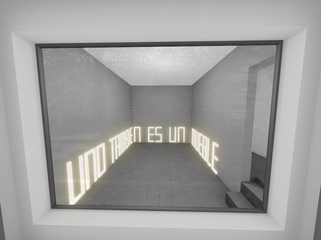 Esta especie de poema concreto es una intervención que establece un juego con las características del dispositivo de la vitrina. El texto recorre el espacio perimetralmente haciendo referencia a algo que podría haber en su interior; un juicio de verdad que manifiesta una condición del ser y/o del cuerpo como mercancía. A su vez, presenta al adjetivo y pronombre “uno” como ser y como unidad; como elemento sistémico, o como una forma de auto referencia, mientras se refiere a todos o a muchos. La luz aparece como un contrasentido del enunciado, pone manifiesto justamente a la existencia como algo que va más allá de la materia, genera una tensión que abre el mensaje hacia su propio cuestionamiento.